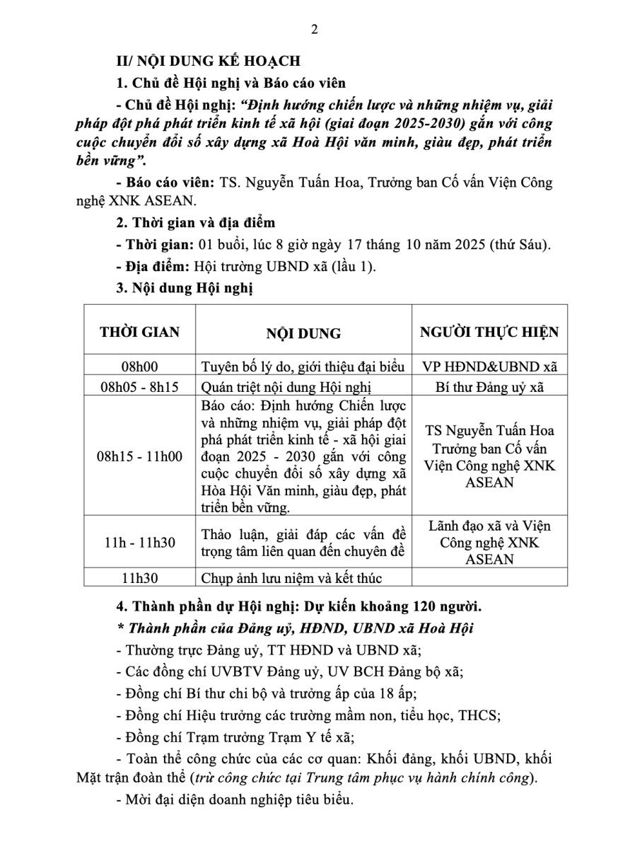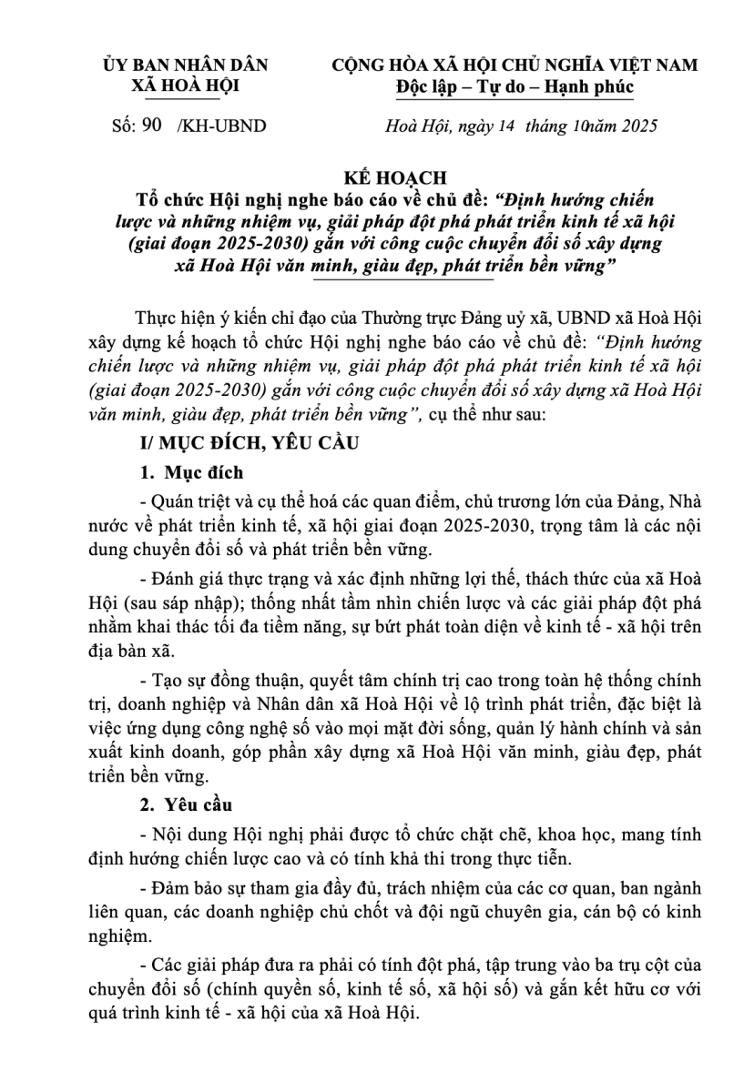 Tổ chức Hội nghị nghe báo cáo về chủ đề: “Định hướng chiến lược và những nhiệm vụ, giải pháp đột phá phát triển kinh tế xã hội (giai đoạn 2025-2030) gắn với công cuộc chuyển đổi số xây dựng xã Hoà Hội văn minh, giàu đẹp, phát triển bền vững”